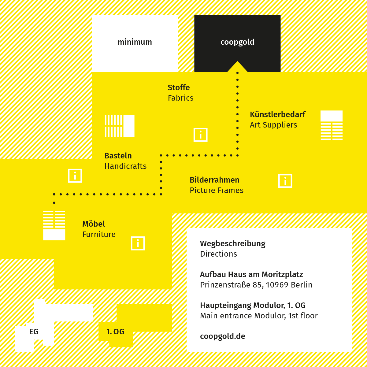 Nimm die erste Treppe ins 1. Obergeschoss und gehe an den Abteilungen für Möbel, Basteln und Bilderrahmen vorbei. Danach hältst du dich links in Richtung Künstlerbedarf und Stoffe, oder rechts neben dem Einrichtungshaus minimum.